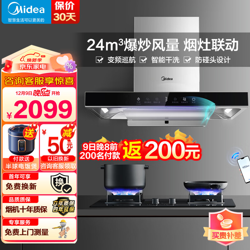 美的(Midea)家用抽油烟机24立方大吸力欧式顶吸变频巡航排烟机智能干洗挥手控制厨房电器以旧换新TP80价格:2099.00元!