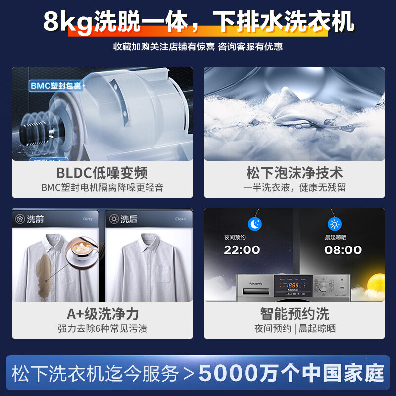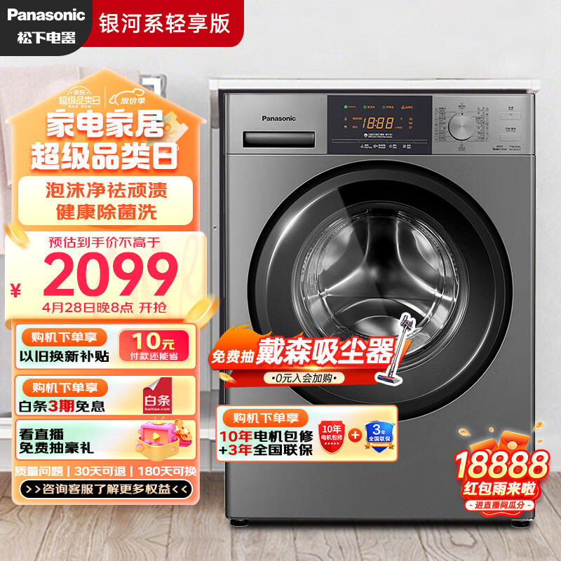 松下(Panasonic)滚筒洗衣机全自动 超薄全嵌【银河系轻享版】8公斤 99.99%高效除菌 泡沫净祛渍XQG80-ESN81价格:2099.00元!