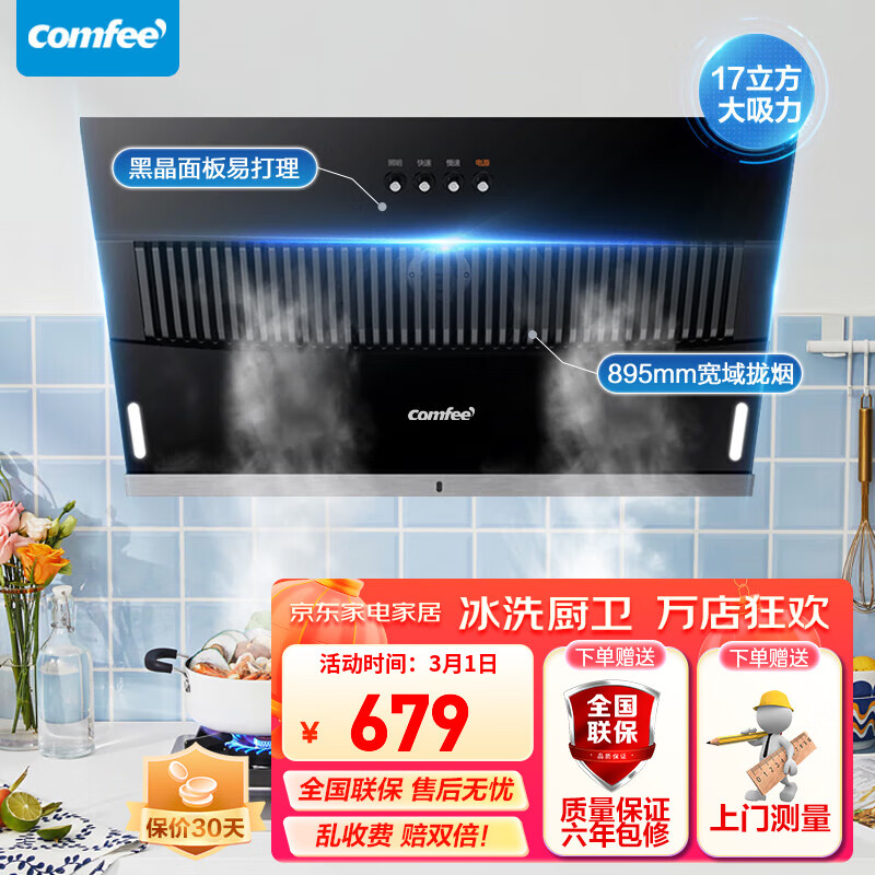 美的(Midea)出品吸油烟机侧吸式家用出租厨房脱排抽油烟机 17/18立方大吸力烟机 上门安装 17吸力comfee油烟机K3价格:699.00元!
