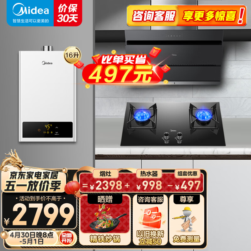美的(Midea)侧吸抽油烟机灶具烟灶多件套装燃气热水器家用烟灶燃热厨房三件套JN205+Q330+16HWF天然气价格:2899.00元!