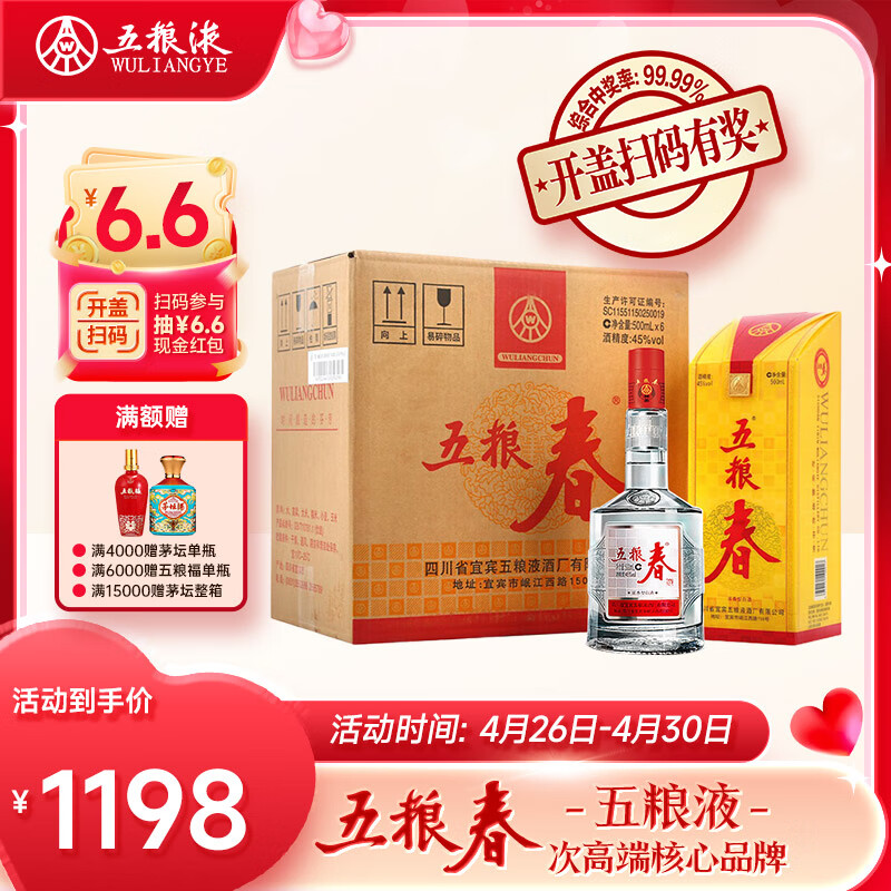 五粮液 五粮春 浓香型白酒 45度 500ml*6瓶 整箱装价格:1168.00元!