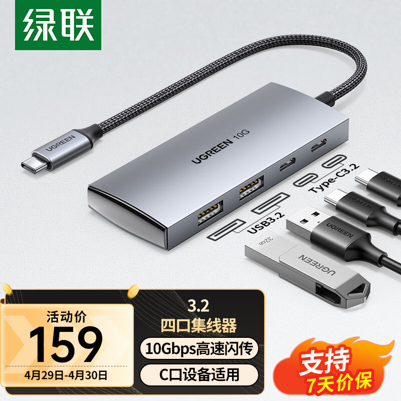 绿联Type-C3.2分线器10Gbps扩展坞 USB-C3.2Gen2高速4口拓展坞集线器HUB 转接头笔记本平板电脑价格:159.00元!