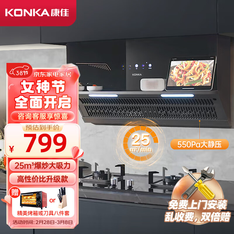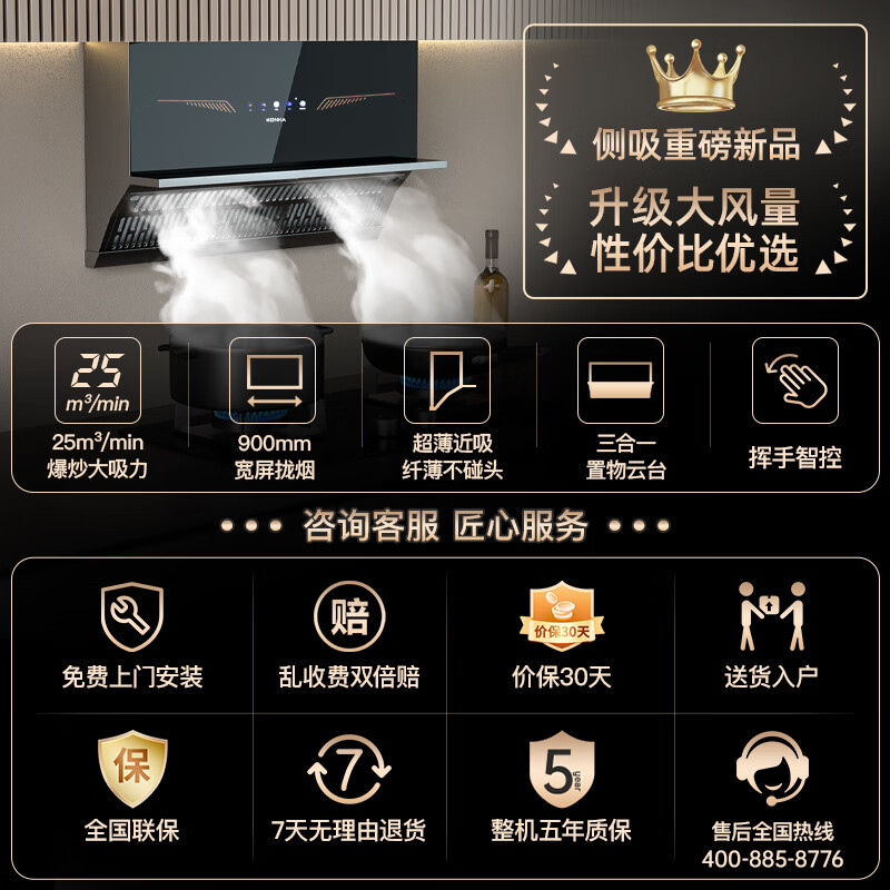 康佳(KONKA)侧吸式抽油烟机 超薄直吸 25m3爆炒大吸力 彩屏挥手控制 置物云台 可拆洗油网CXW-330-KJ36价格:849.00元!