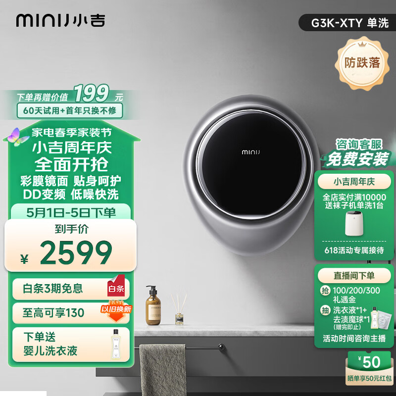 小吉(MINIJ)彩膜智慧大屏壁挂 迷你滚筒洗衣机全自动 DD直驱变频 专属母婴洗衣机 G3K-XTY价格:2719.00元!