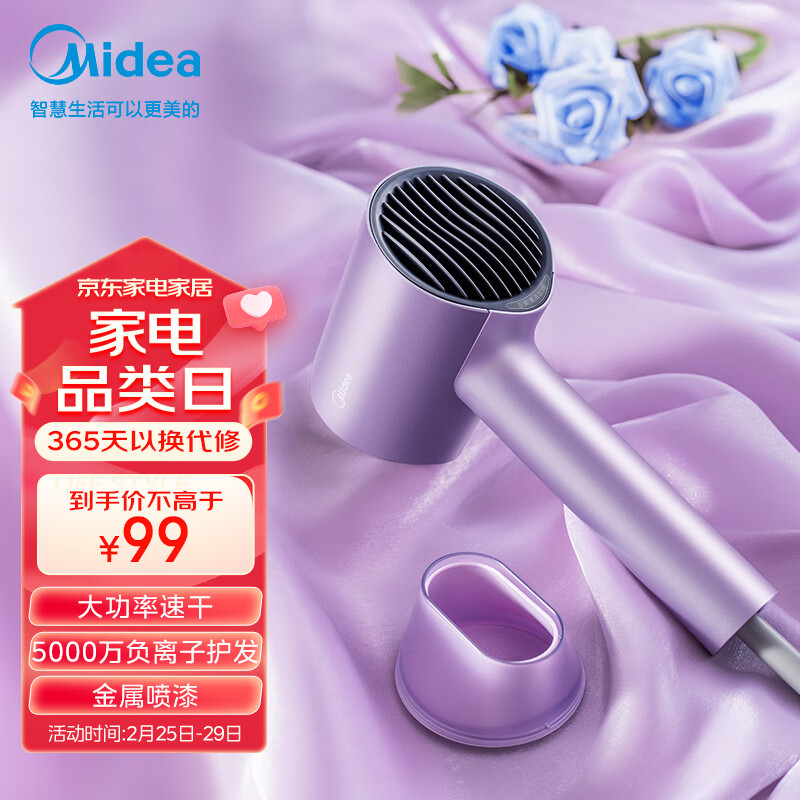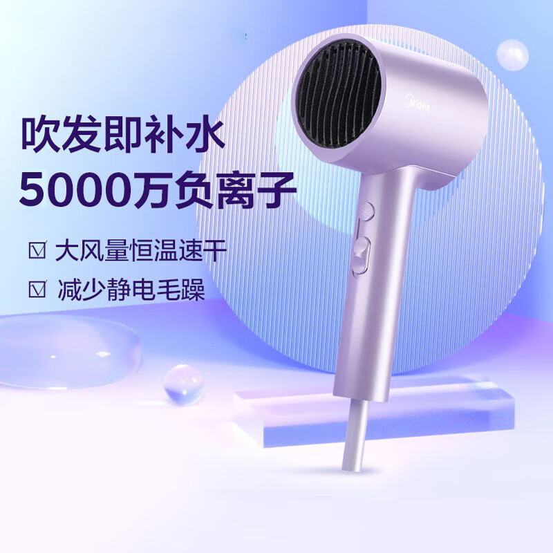 美的(Midea)五千万负离子电吹风 大功率 家用速干柔顺护发吹风筒 电吹风机 节日礼物 MB-AJ0504极光紫价格:99.00元!