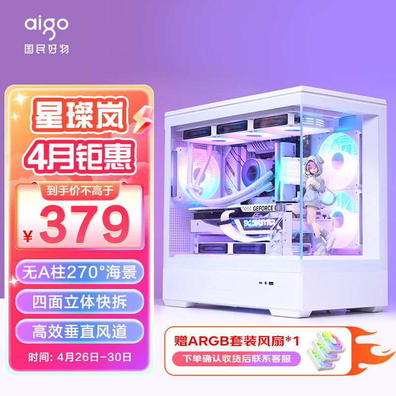 爱国者(aigo)星璨 岚 白色 游戏电脑台式主机箱 支持360水冷 水族馆/M-ATX主板/四面快拆/270°海景房价格:379.00元!