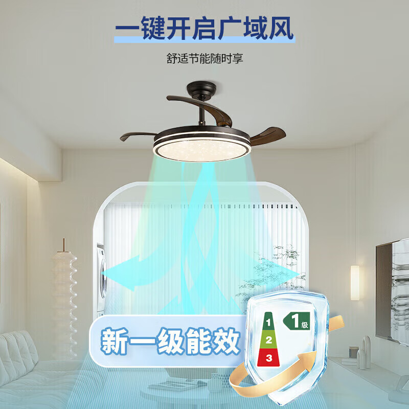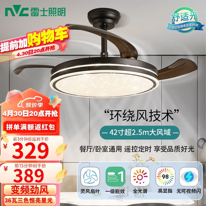 雷士(NVC)风扇灯吊扇灯北欧餐厅卧室黑色led灯具全光谱1级能效遥控42寸36瓦价格:587.00元!