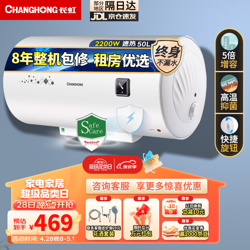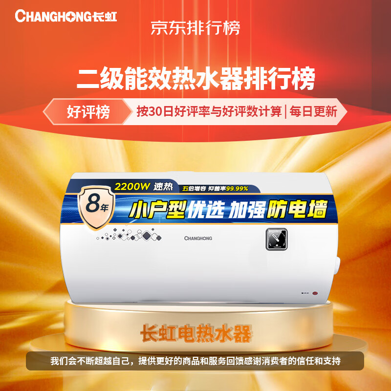 长虹(CHANGHONG)50升电热水器家用五倍增容2.2KW大功率速热节能保温小巧易操控抗腐耐用双重防漏电Y50J01价格:469.00元!