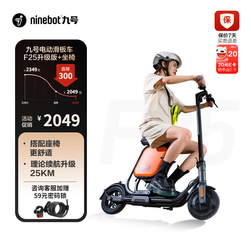 Ninebot 九号电动滑板车F25升级款+多功能座椅长续航成人学生便携可折叠电动车双轮平衡车体感车价格:1849.00元!