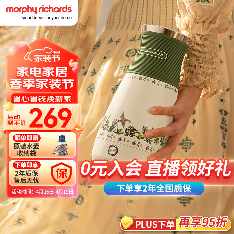 摩飞电器(Morphyrichards)电水壶小型便携式烧水壶旅行电热水壶不锈钢双层防烫 MR6090 大英联名款 绿色价格:269.00元!
