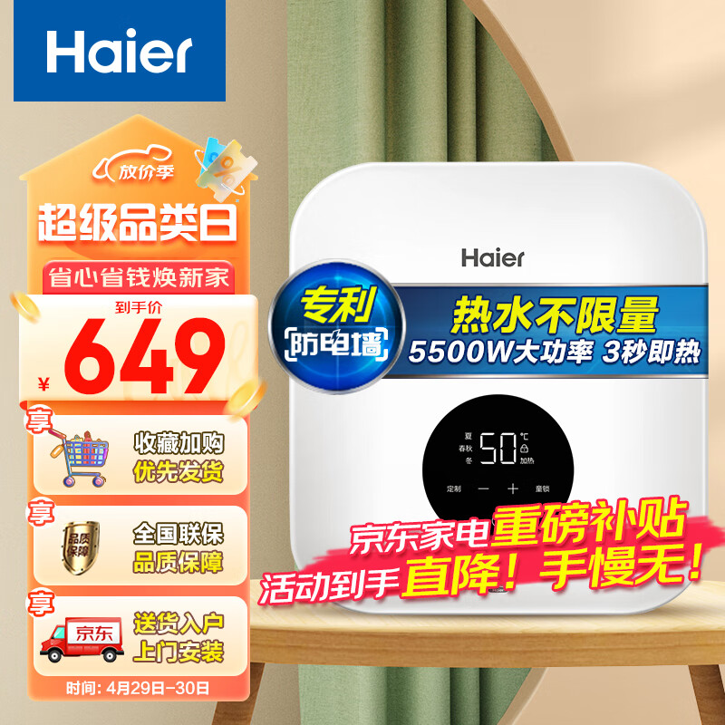 海尔(Haier)即热式小厨宝电热水器电即热 5500W双驱变频即开即热 小尺寸热水无限供应 DSC-55B1价格:649.00元!