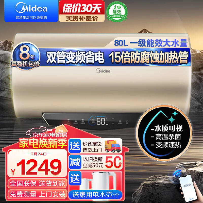 美的(Midea)80升大功率速热储水式电热水器家用2100W/3300W双管变频水质监测一级能效以旧换新F8032-JA4(HE)价格:1249.00元!