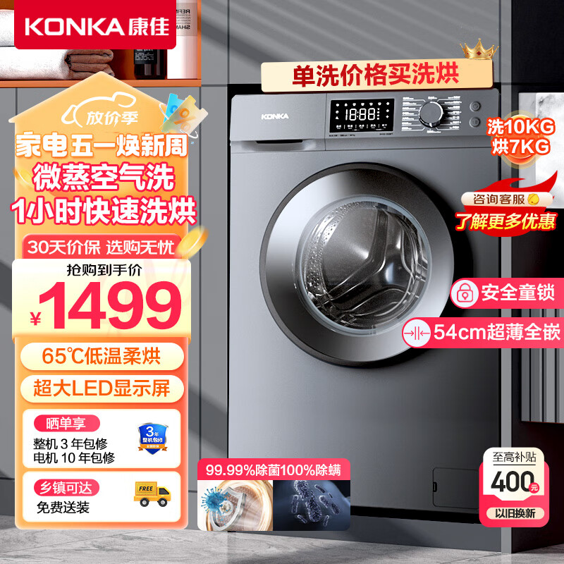 康佳(KONKA)洗衣机10KG超薄全自动滚筒洗衣机 洗烘一体机 内衣洗衣机 上排水 烘干除螨大容量 KH100-1202BPT价格:1499.00元!