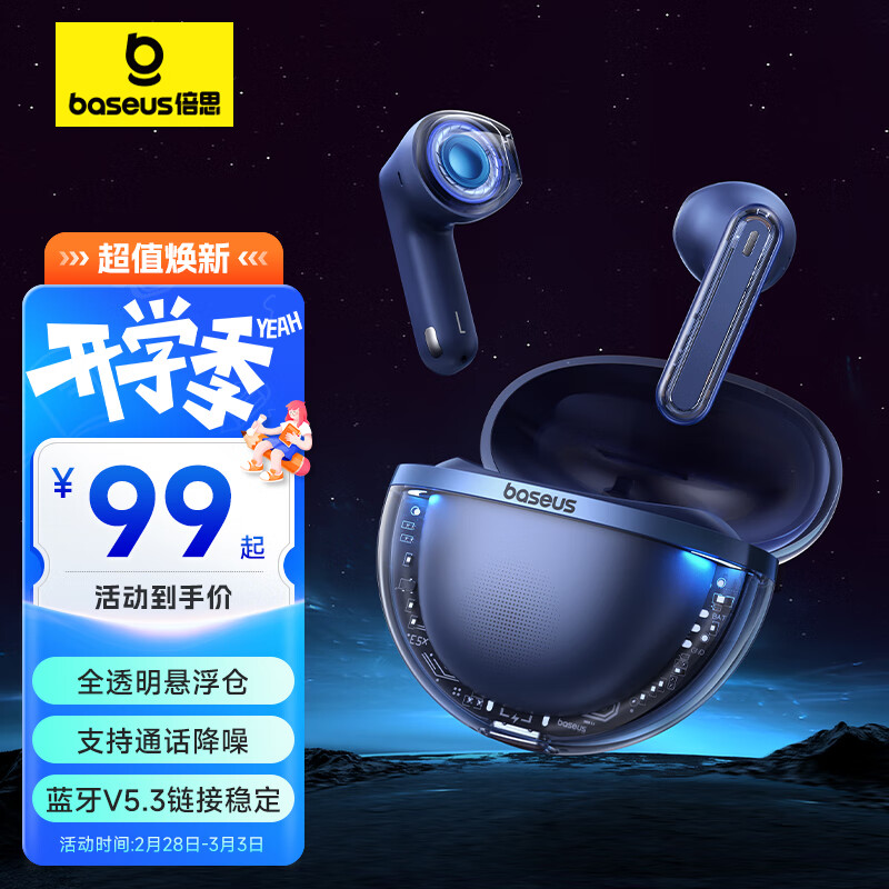 倍思 E5x 真无线蓝牙耳机 半入耳舒适佩戴 通话降噪长续航蓝牙5.3音乐透明风耳机适用苹果华为小米 蓝价格:159.00元!