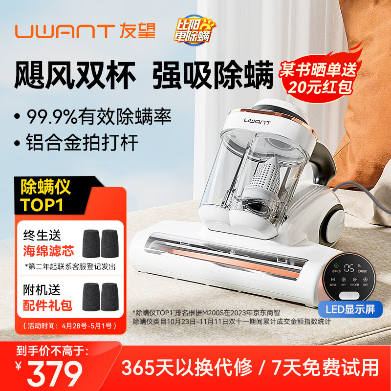 uwant友望除螨仪轻省款 双杯尘螨分离 家用床上紫外线杀菌除螨机去螨虫大吸力吸尘神器M200S小飓风价格:379.00元!