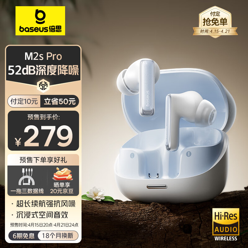 倍思 M2s Pro真无线蓝牙耳机 52dB主动降噪耳机金标认证35h长续航 蓝牙5.4入耳式适用苹果华为手机 白价格:279.00元!