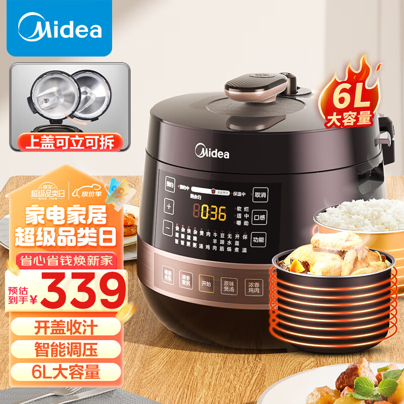 美的(Midea)全自动智能预约电锅 6L大容量 家用易清洁不粘双胆煲汤炖肉保温YL60Easy203电饭煲高压锅3-8人价格:338.00元!