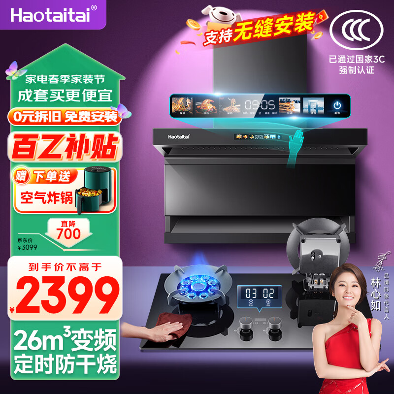 Haotaitai静音变频油烟机 顶侧双吸烟灶套装FJ9BP吸油烟机+M2燃气灶5.2KW猛火灶具-天然气价格:2399.00元!