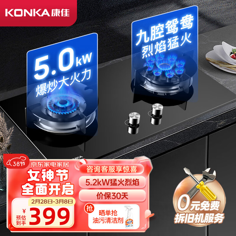 康佳(KONKA)燃气灶双灶 家用5.0kW九孔聚能猛火鸳鸯灶具 台式/嵌入式钢化玻璃灶台 JZY-B900Y(液化气)价格:399.00元!