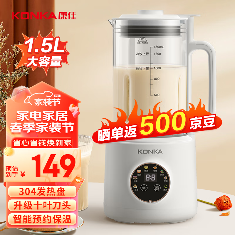 康佳(KONKA) 破壁机 多功能豆浆机家用预约加热破壁料理机榨汁机辅食机 1.50L热荐款 | 破壁无渣 | 智能预约价格:159.00元!