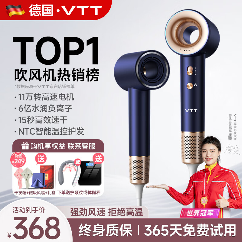 VTT【德国】高速吹风机家用大功率负离子养护发大风力速干不伤发低噪音便携吹造型专业电吹风筒送礼物价格:368.00元!