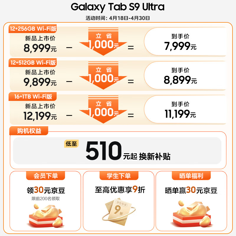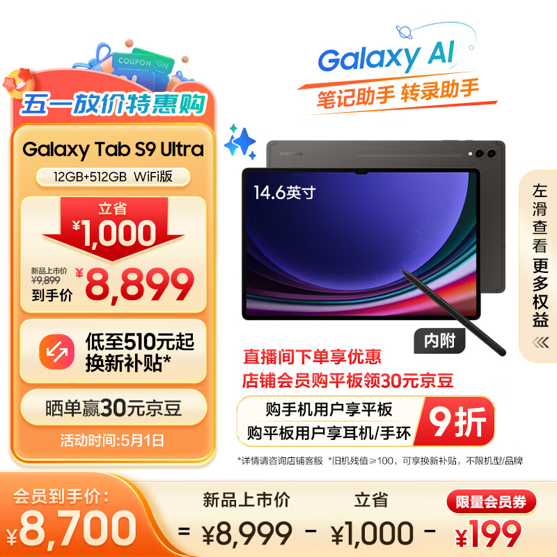 三星(SAMSUNG)S9 Ultra Al智享学习办公平板电脑14.6英寸 120Hz 12G+512GB WIFI版 AI平板 云影灰价格:8899.00元!