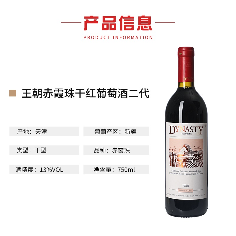 商品名称:王朝王朝干红葡萄酒二代750ml*6瓶(整箱装)