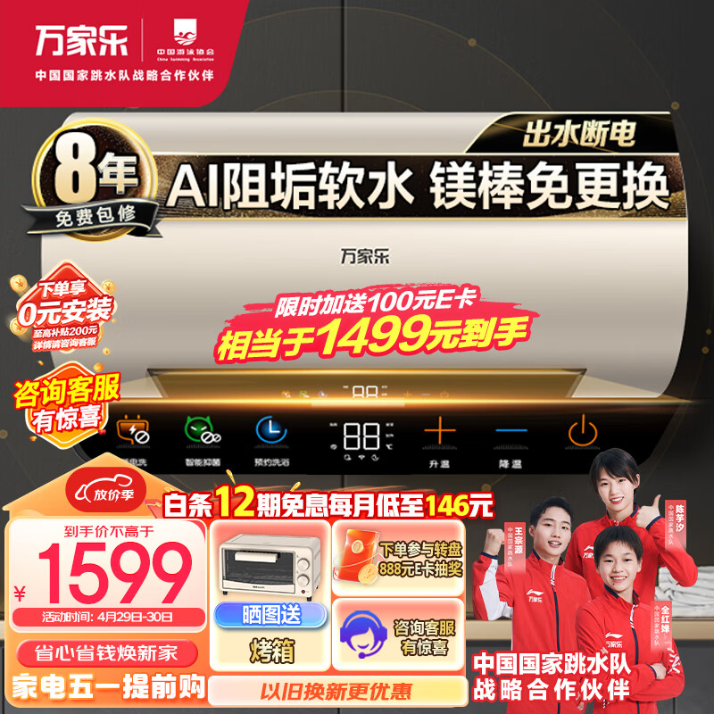 万家乐60升电热水器3200W速热 FOF阻垢净浴 智能杀菌 镁棒免换 出水断电 一级能效D60-FW7价格:1799.00元!