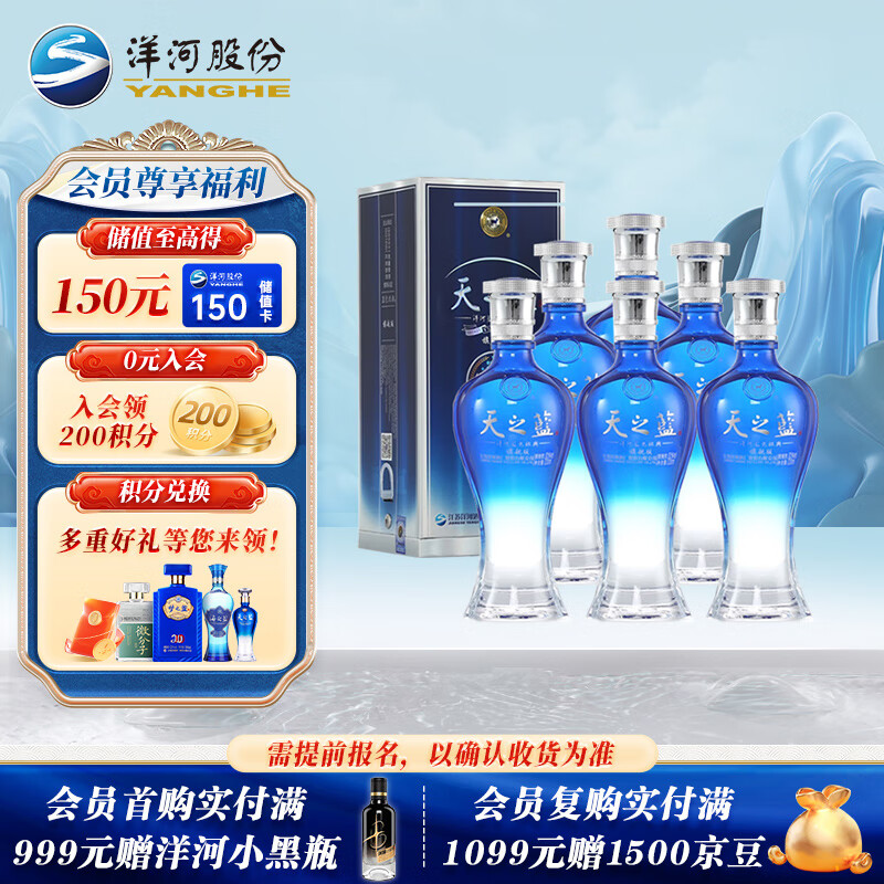 洋河 蓝色经典 天之蓝 52度 520ml*6瓶 整箱装 绵柔浓香型白酒 送礼价格:2448.00元!