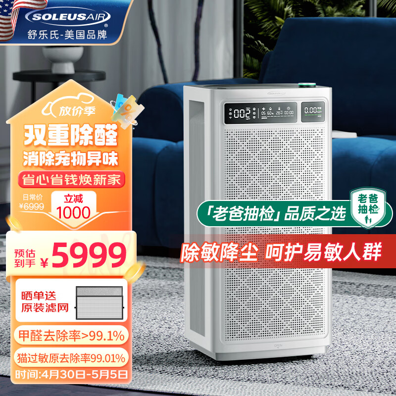 SOLEUSAIR舒乐氏空气净化器宠物除菌猫毛吸附除花粉过敏原异味除甲醛雾霾母婴除菌消毒机 卫健委备案B01价格:5999.00元!