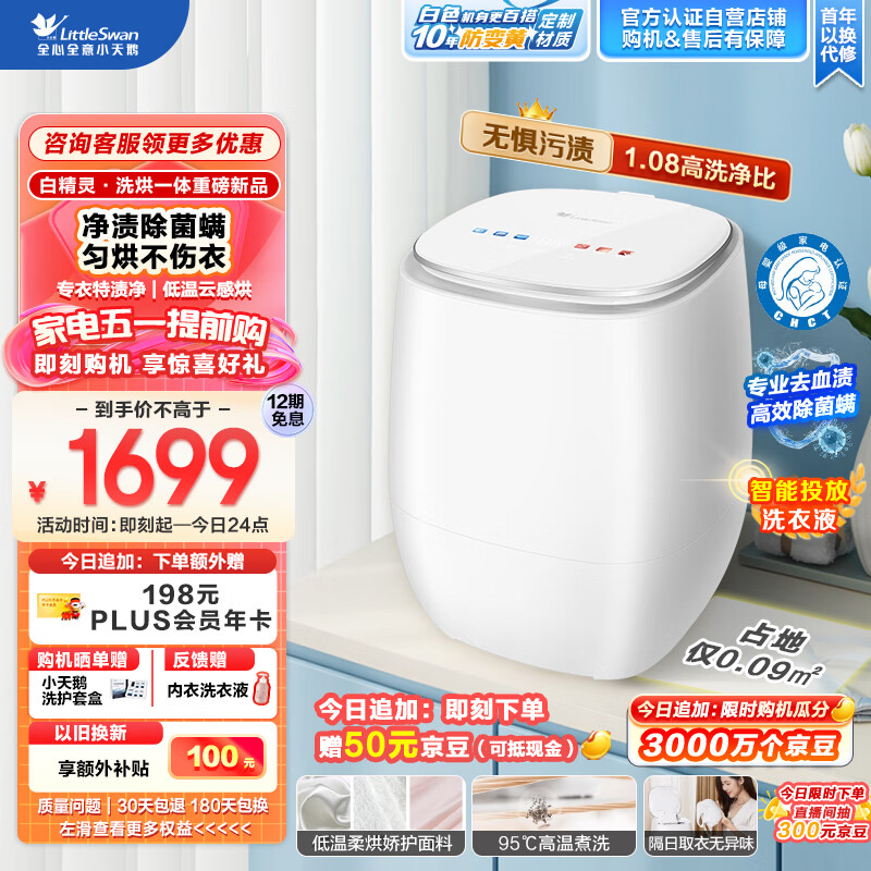 小天鹅(LittleSwan)0.5KG迷你洗衣机全自动 白精灵 去血渍洗烘一体 内衣裤洗衣机 高温煮洗除菌螨 精准智投 TND5VD0WE价格:1819.00元!
