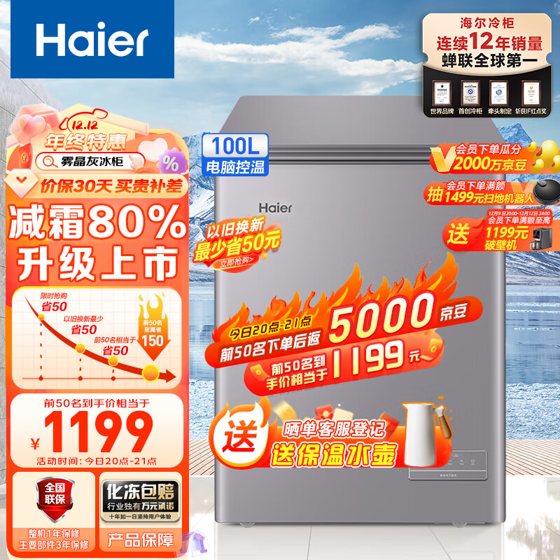 海尔(Haier)100升-40℃智控低霜小冰柜家用商用 冷藏柜冷冻柜冰柜小型小冰箱小型冷柜BC/BD-100GHEPC 以旧换新价格:1249.00元!