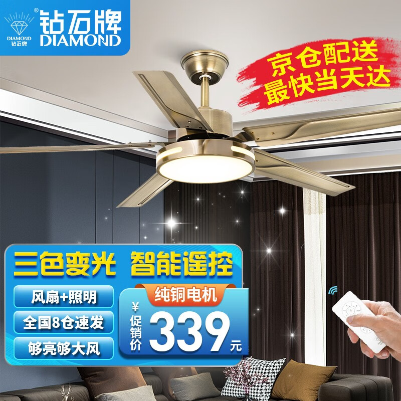 钻石牌(DIAMOND) 风扇灯吊扇大风力客厅餐厅带灯吊扇中式复古简约吊扇灯LED照明遥控一体风扇 5310古铜色吊扇灯/遥控(52寸)价格:369.00元!