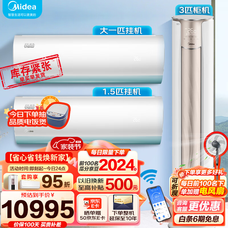 美的(Midea)空调套装 新一级能效 变频挂机柜机 立式空调客厅 3匹锐静+大1匹极酷+大1.5匹极酷 二室一厅 价格:10995.00元!