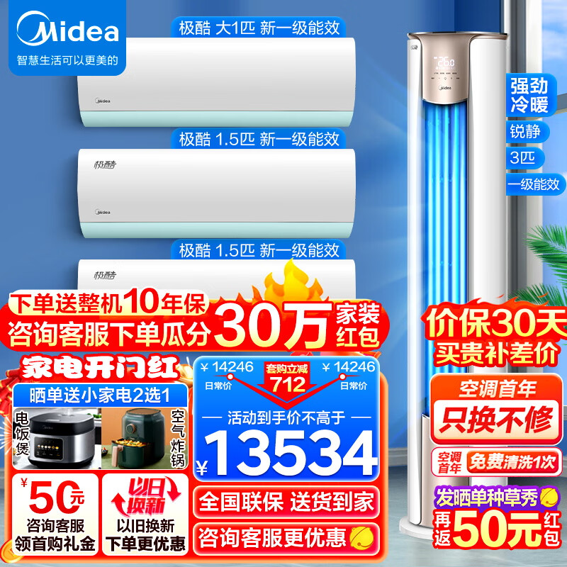 美的(Midea)新一级能效 空调套装 三室一厅 锐静+极酷 省电节能套餐 变频冷暖空调 72VHC1+35VHA1(2台)+26VHA1价格:13334.00元!