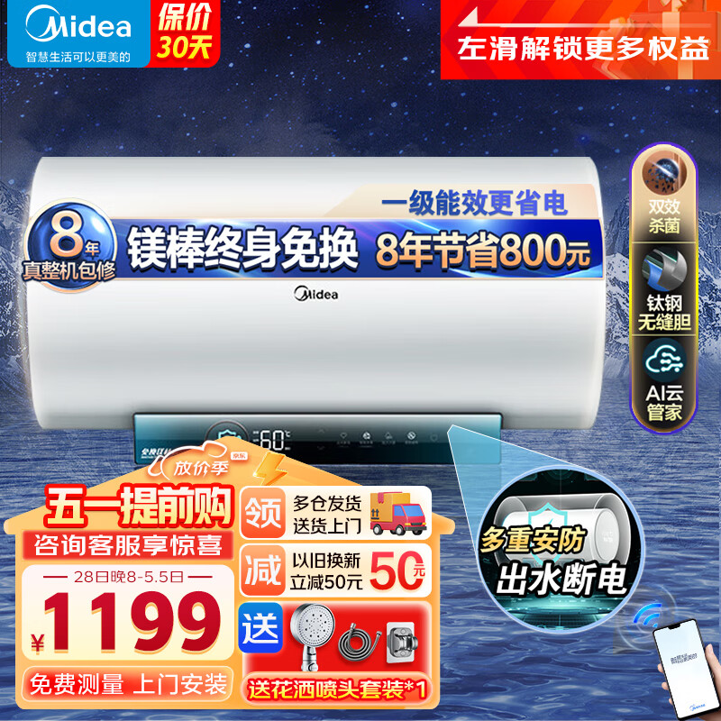 美的(Midea)60升电热水器一级能效省电出水断电终身免换镁棒速热加长防电墙速热以旧换新F6032-JA5(HE)价格:1199.00元!