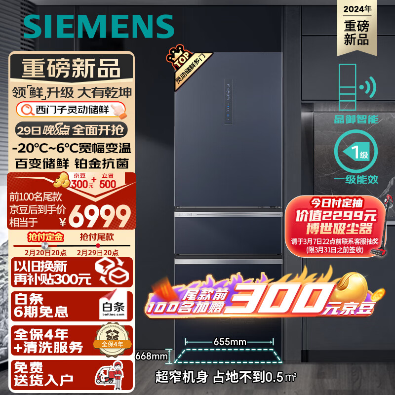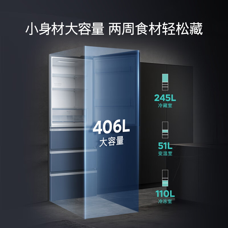 西门子(SIEMENS)406升灵动储鲜宽幅变温铂金抗菌净味晶御智能一级能效大容量多门冰箱湖蕴蓝406W(KG405951VC)价格:7299.00元!