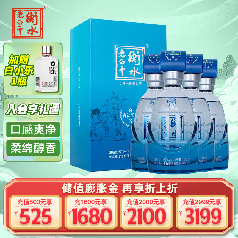 衡水老白干古法酿造A3 老白干香型 52度 500ml*4瓶整箱装 纯粮白酒 聚会宴请价格:439.00元!