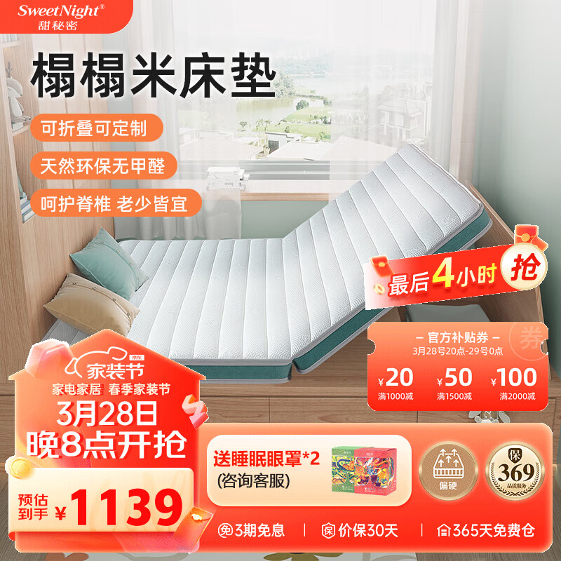 Sweetnight榻榻米床垫天然椰棕床垫8cm床垫子 可定制甜秘密丹左B款1.35x2米价格:1139.00元!