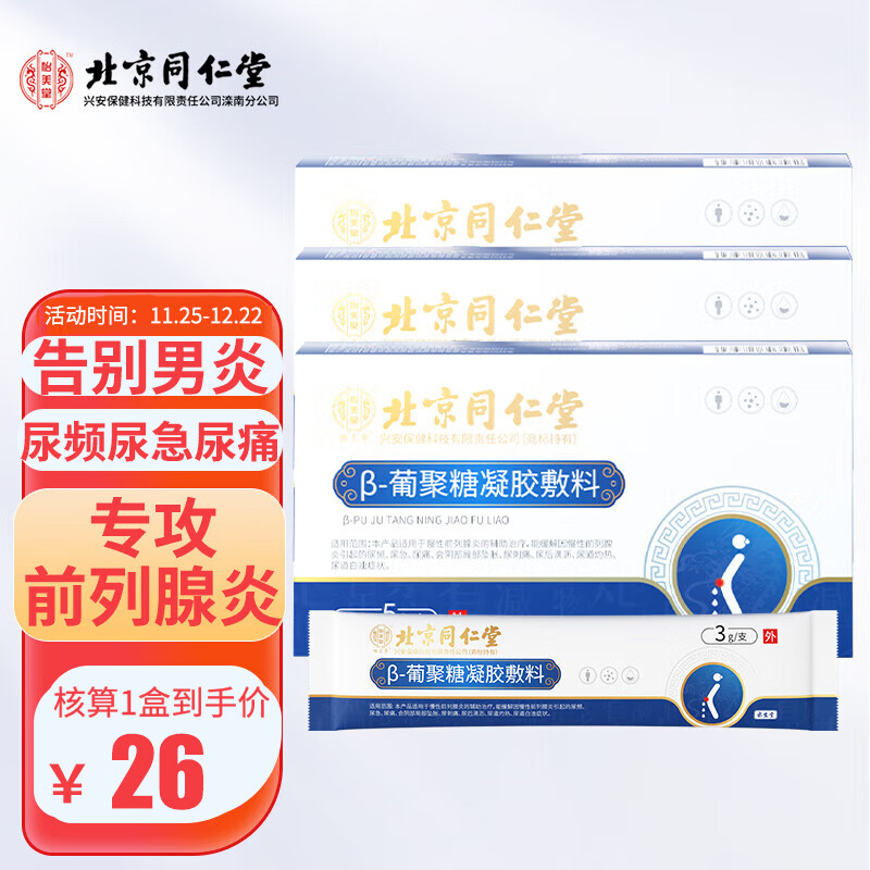 北京同仁堂 β-葡聚糖凝胶敷料3盒(3g/支*5支/盒) 男科专用尿频尿急尿痛滴沥尿道灼热白浊慢性前列腺炎凝胶价格:109.90元!