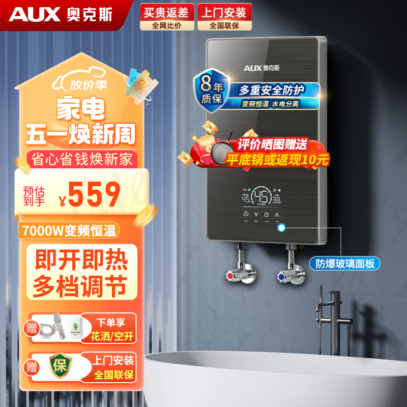 奥克斯(AUX)即热式电热水器电 速热智能变频多功率可调家用卫生间洗澡小型超薄热水宝即开即热恒温免储水 7000W 变频恒温+水电分离【升级银河灰】价格:559.00元!