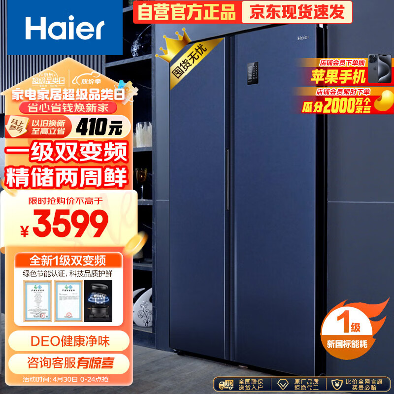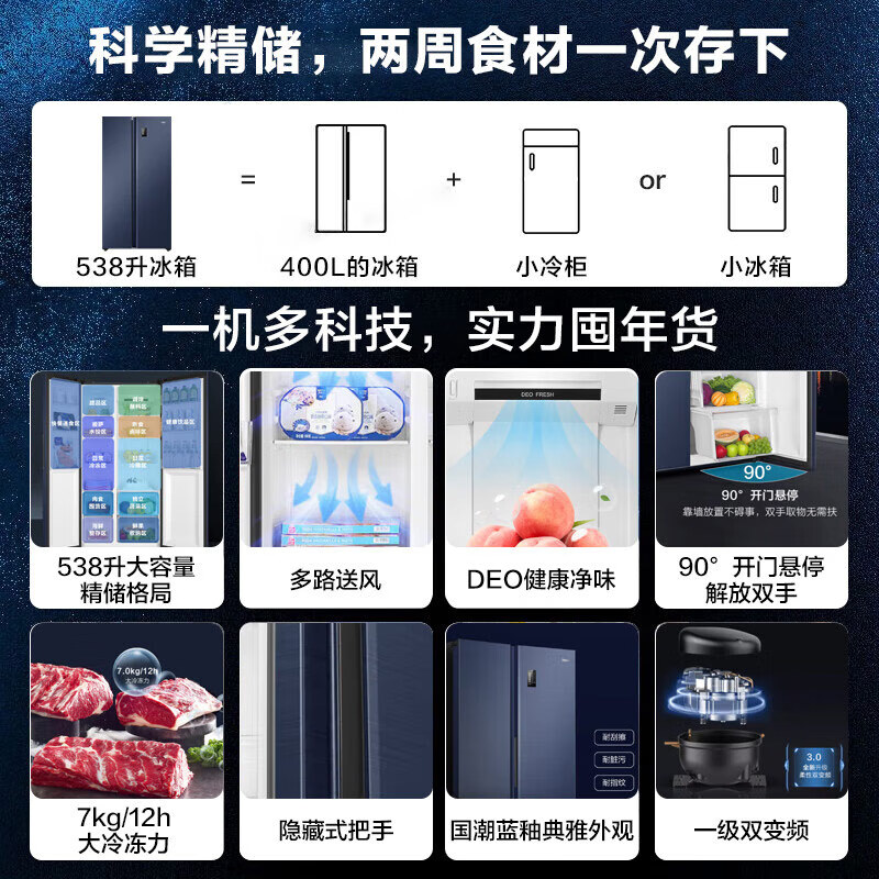 海尔(Haier)538升风冷无霜对开双开门超薄家用电冰箱双变频一级能效嵌入式超大容量BCD-538WGHSSEDBL价格:3599.00元!