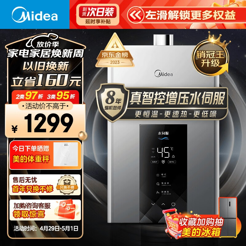 美的(Midea)16升燃气热水器 天然气 增压水伺服恒温 变频节能 开机自检 多重安防 金刚速热舱 JSQ30-MK6耀夜价格:1299.00元!