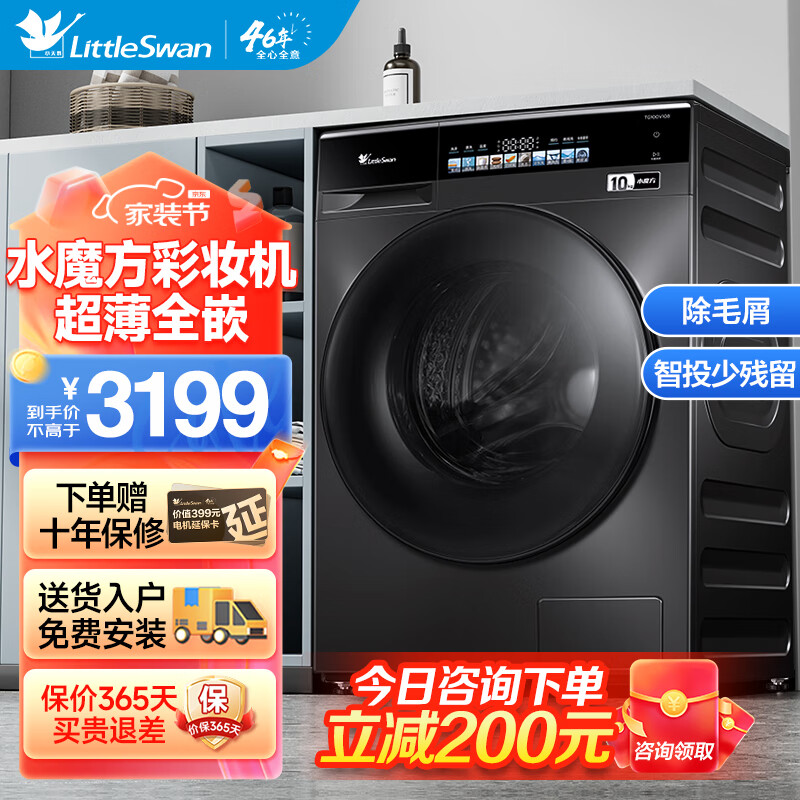 小天鹅(LittleSwan)10公斤滚筒洗衣机洗脱一体超薄全嵌彩屏触控水魔方冷水洗除菌除螨 以旧换新TG100V108价格:3199.00元!