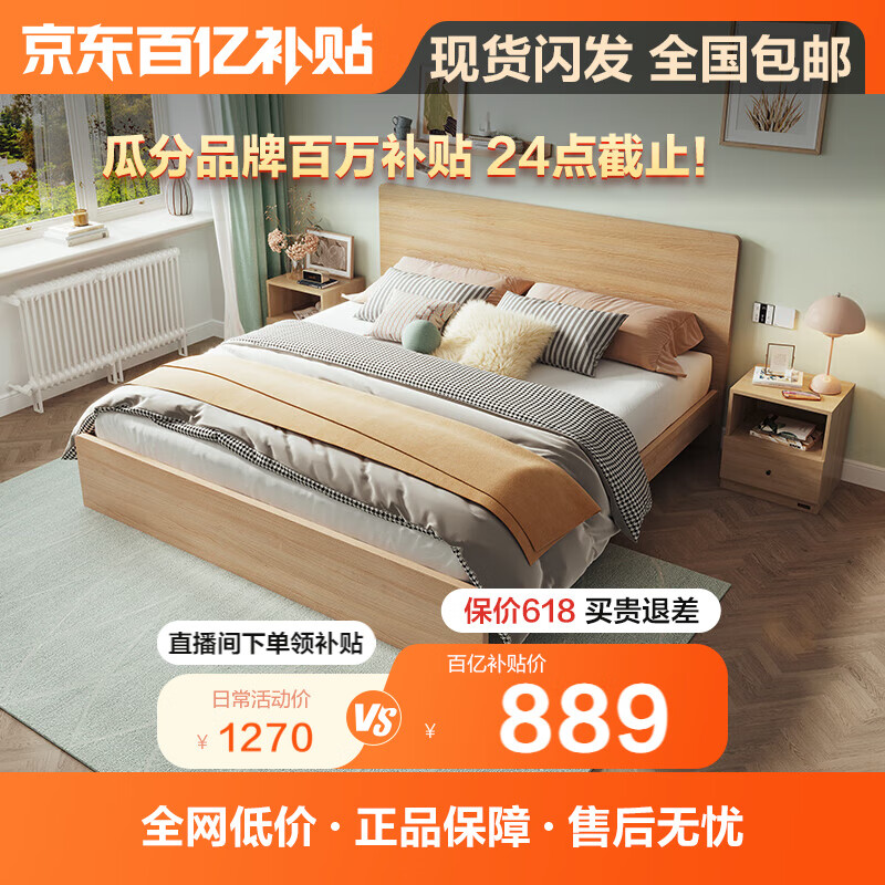 全友家居 床简约卧室家具木板床 1.8米北欧原木色双人床价格:888.69元!