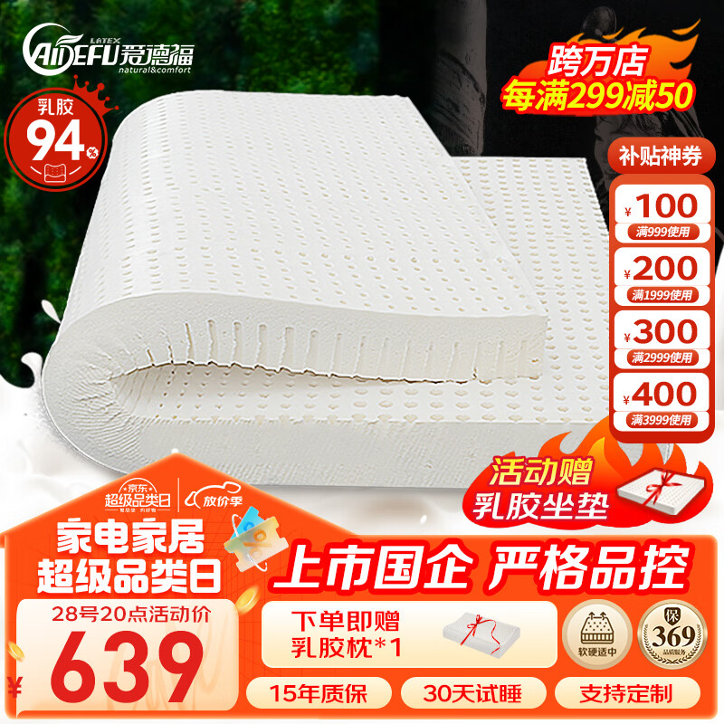 爱德福乳胶床垫泰国进口天然乳胶 榻榻米1.5m1.8单双人150*200*5(85D)价格:759.00元!