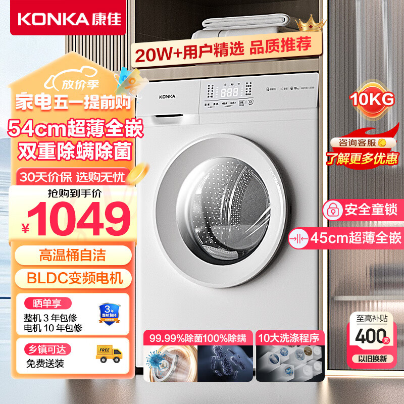 康佳10公斤滚筒洗衣机全自动 变频电机 大容量超薄全嵌 触控操作 除菌除螨 一级能效KG100-1205B价格:1049.00元!