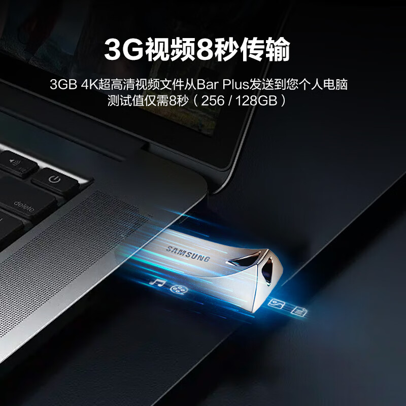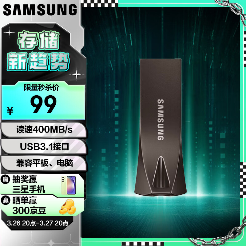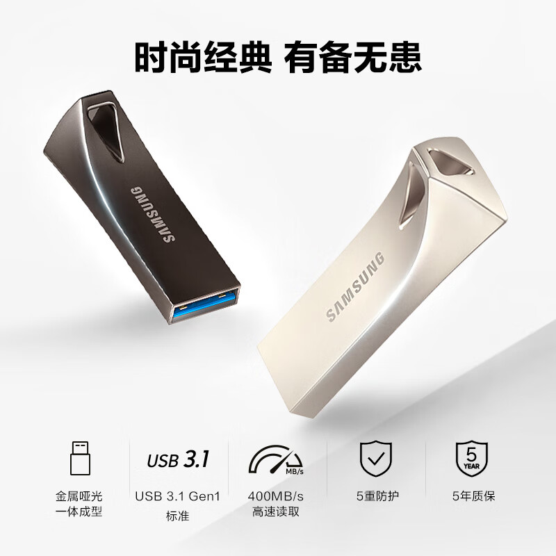 三星(SAMSUNG)128GB USB3.1 U盘 BAR升级版+深空灰 金属优盘 高速便携 学生办公 读速400MB/s(Gen 1)价格:99.00元!