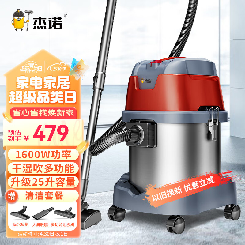 杰诺1600W大功率干湿吹三用桶式吸尘器家用商用办公室地毯装修JN603价格:499.00元!
