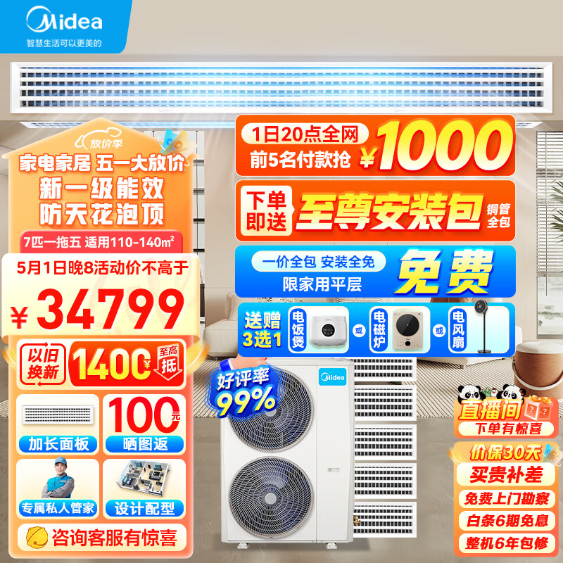 美的(Midea)中央空调一拖五风管机7匹多联机星光全直流变频新一级能效智能冷暖清洁嵌入式隐形嵌系列MDS三代价格:34899.00元!